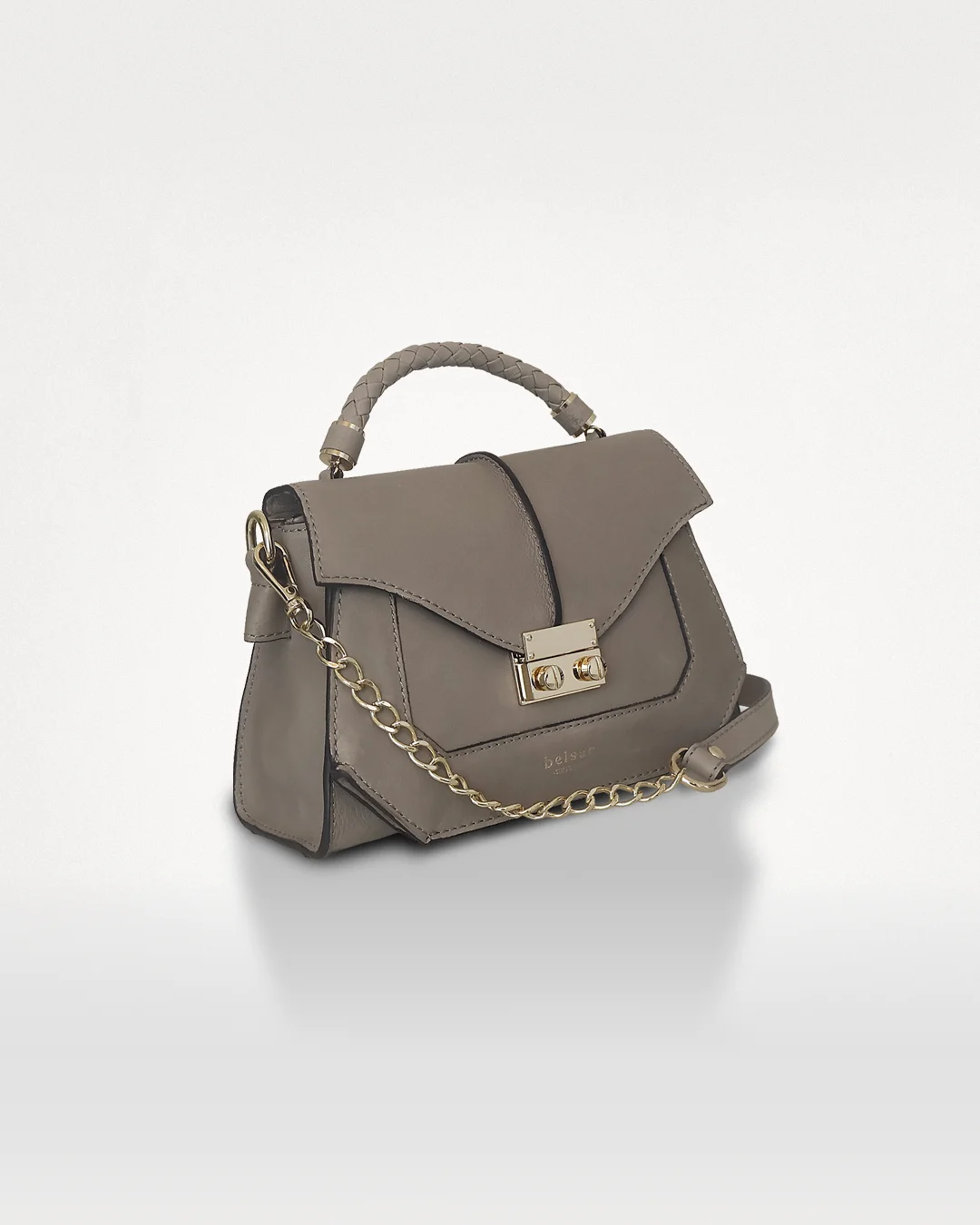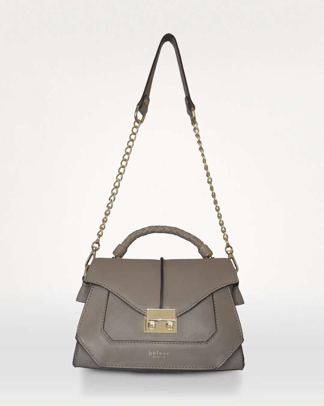 Indvendigt rummer tasken ét stort rum og en lynlåslomme, foret i cognac. Flore kan bæres i hånden via hanken eller over skulderen med den aftagelige korte skulderrem i kæde. Guldfarvet beslag fuldender udtrykket.
