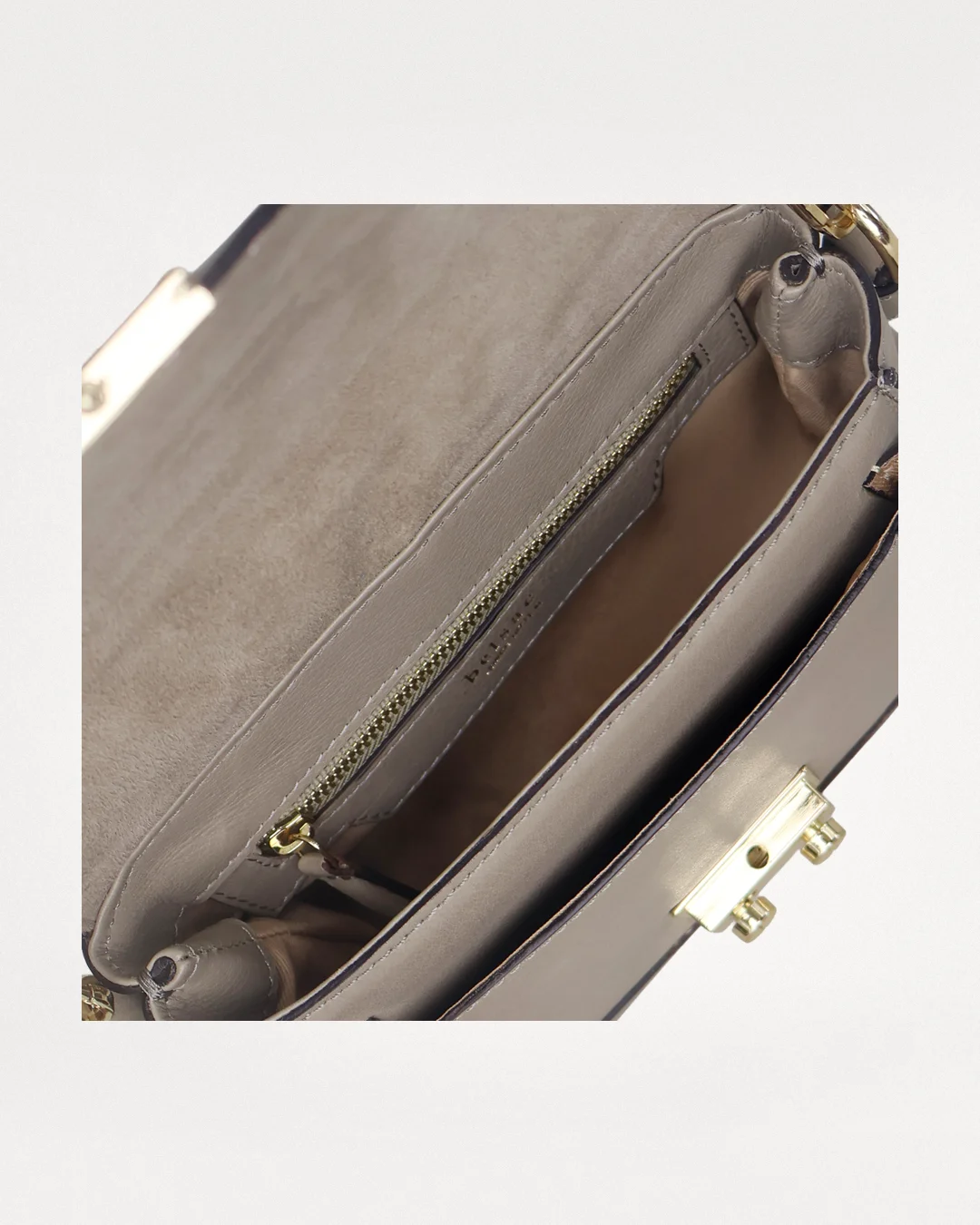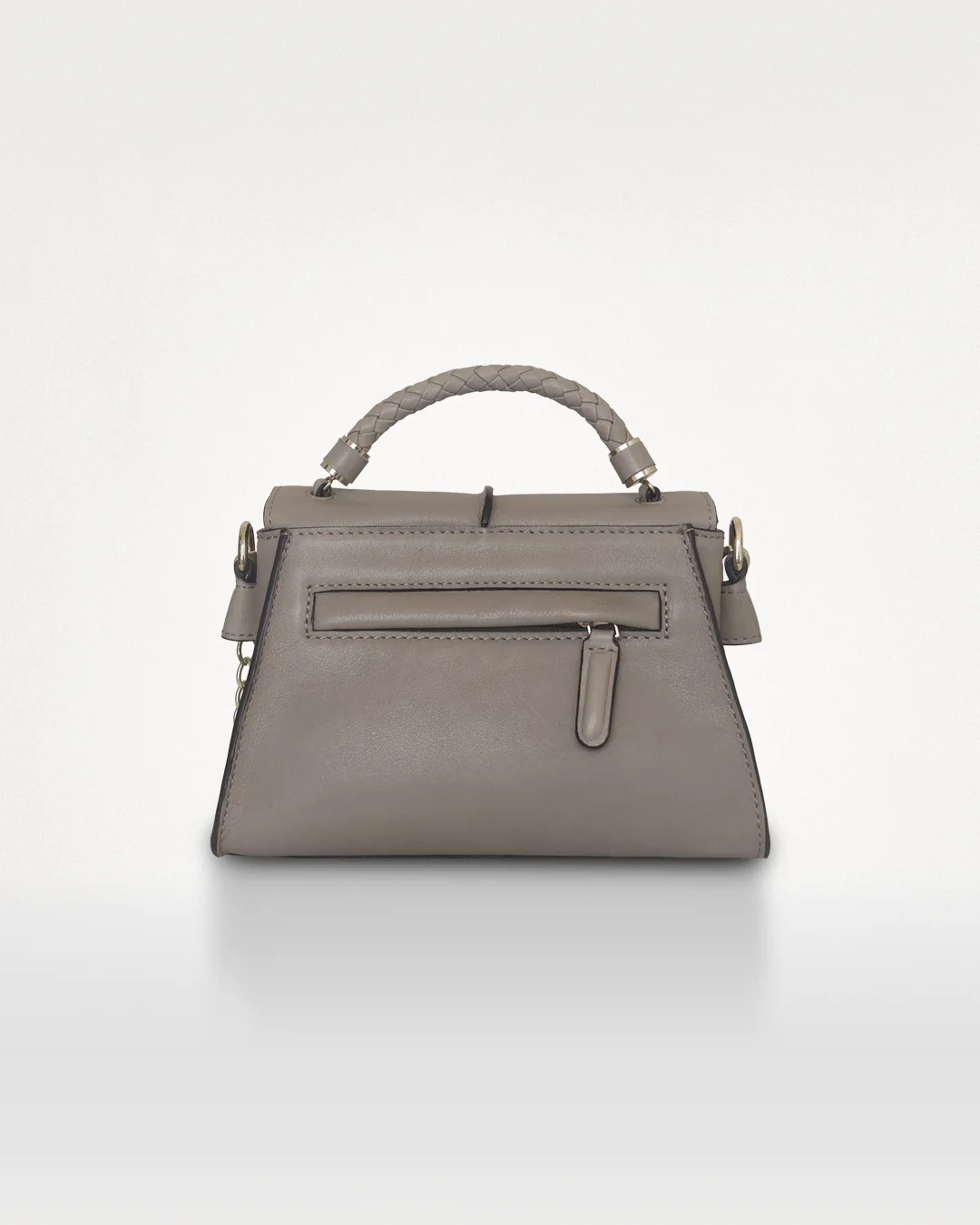 I forlommens skrå hjørner er der indsat små stykker læder, som gør det muligt for lommen at udvide sig nederst ved behov. Det sikrer, at tasken stadig kan lukkes uden besvær – også når forlommen er i brug. På bagsiden findes en diskret lynlåslomme, elegant afsluttet med paspel.